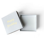Presentasken är vit med guld text "Happy Birthday”.